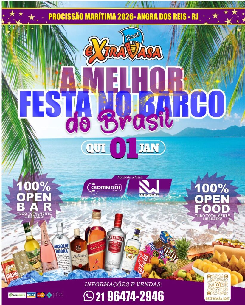 Com mais de 15 anos de tradição e muita animação, o Extravasa Boat se destaca pela qualidade oferecida aos foliões, sob o comando dos irmãos gêmeos Patrick e David Rocha, que possuem mais de 20 anos de experiência em procissões. A embarcação é conhecida como “simplesmente o melhor” e oferece uma experiência completa com 100% OPEN BAR e 100% OPEN FOOD, disponibilizando uma vasta variedade de bebidas como Cervejas, gin, vodka, whisky, tequila, espumantes e mais. O cardápio inclui salgadinhos, sanduíches naturais, mini hambúrgueres e guloseimas.Além de oferecer um LINDO KIT FOLIÃO todo personalizado. (abadá, boné, copo c/ tirante, chaveiro, mochilinha e pulseira). A estrutura do Extravasa Boat inclui uma escuna para 150 pessoas (super confortável), som potente e de alta qualidade, segurança, guarda-vidas, e decoração temática concorrendo a prêmios.