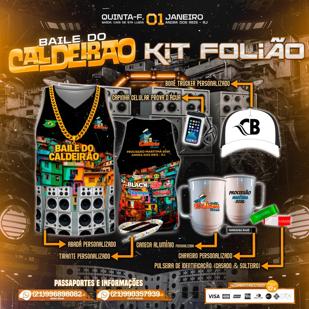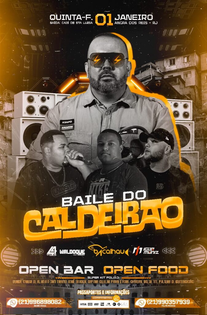 Imagina o grave batendo, o mar balançando e você no Caldeirão Boat, o baile mais insano da Procissão Marítima de Angra dos Reis! 01/01/2026 | Das 10h30 às 16h Tema: BAILE DO CALDEIRÃO