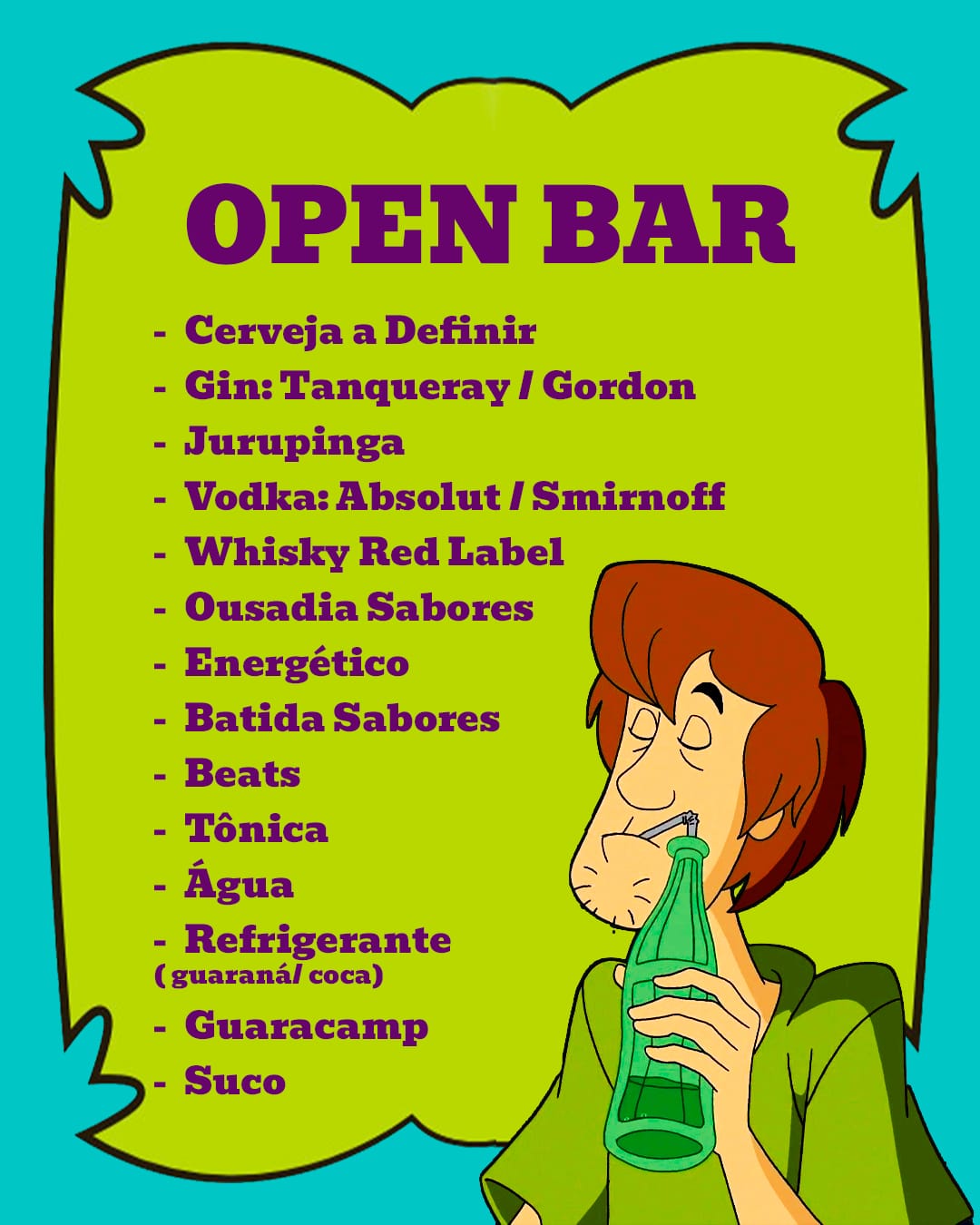 Campeão em Animação | Vice em Originalidade. OPEN BAR PESADO: Cerveja, Whisky Red Label, Vodka Smirnoff, ICE, Espumante, Energéticos, Refrigerante e muito mais! OPEN FOOD MONSTRO: Mini Pizza, Mini Cachorro Quente, Salgadinhos, Mesa de Frutas e até bombons  KIT FOLIÃO EXCLUSIVO: